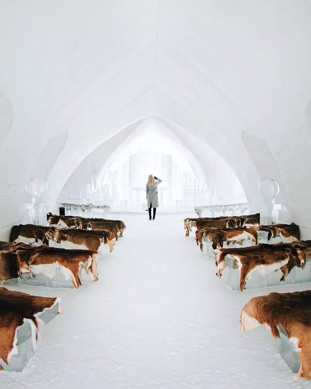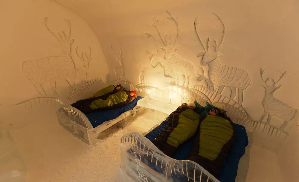 所有客人都会在一个坚固的冰床(配以柔软的床垫)上入睡。酒店建议每位客人只在睡袋里穿保暖的睡衣即可,以保持冰屋内的湿度与温度。