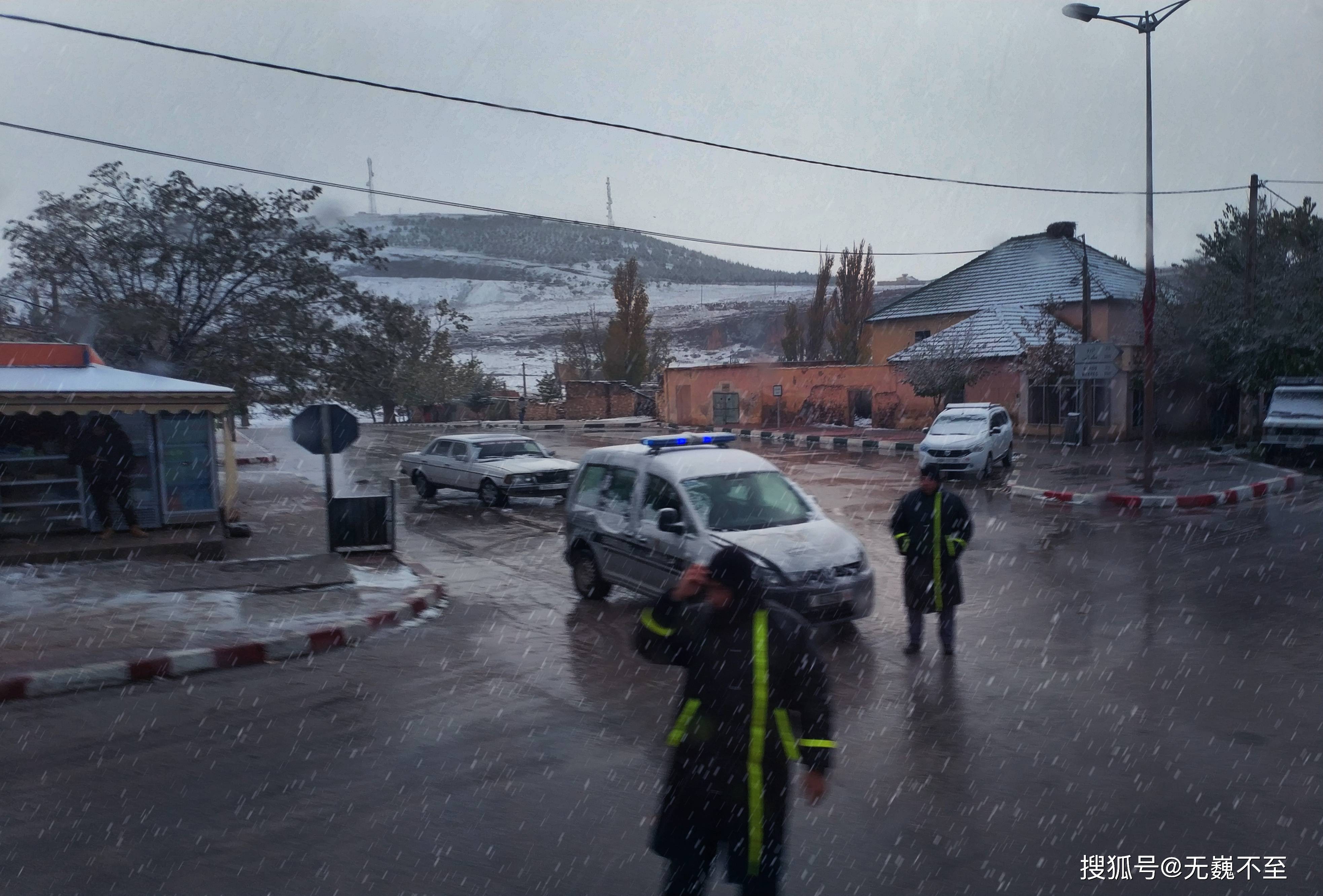 下了垭口,车辆继续行进在平坦的山间谷地中,路边限速牌亦由80降至60.路上车辆越来越少,在一个十字路口,警察设卡实行交通管制,因通往伊芙兰的山路积雪太深,勒令大巴停止前进,原路返回!欧买嘎!幸亏领队当机立断放出大绝招,让司机告诉警察,大巴快没油啦,必须到前面加油站加油,否则...全车人民有性命危险!乖乖,警察立马放行。(事后得知,当日只有我们唯一的一辆大巴通过关卡进入伊芙兰,其余的旅游大巴统统打道回府从南绕道一千多公里多耽误一天才到达伊芙兰。)
