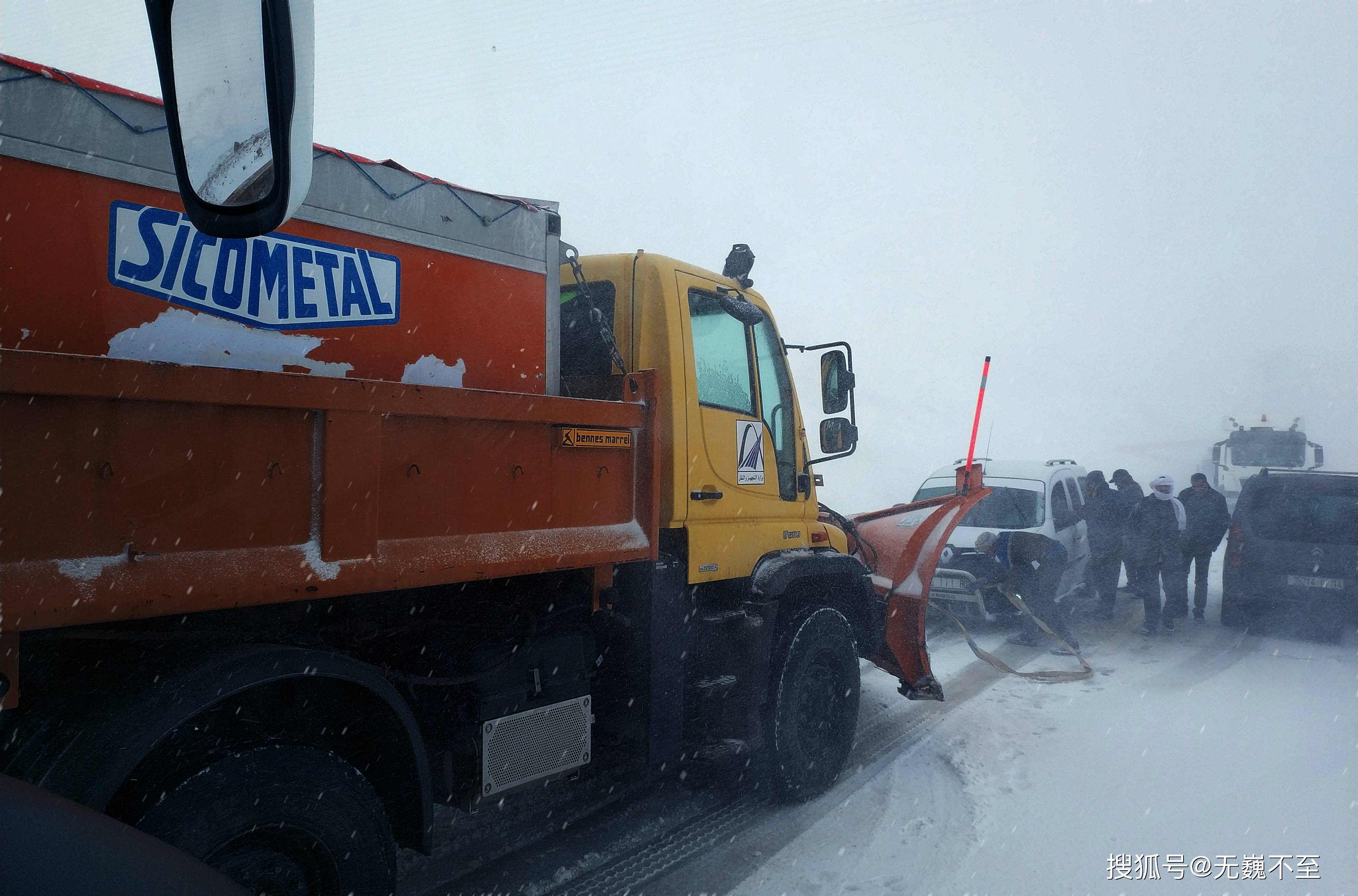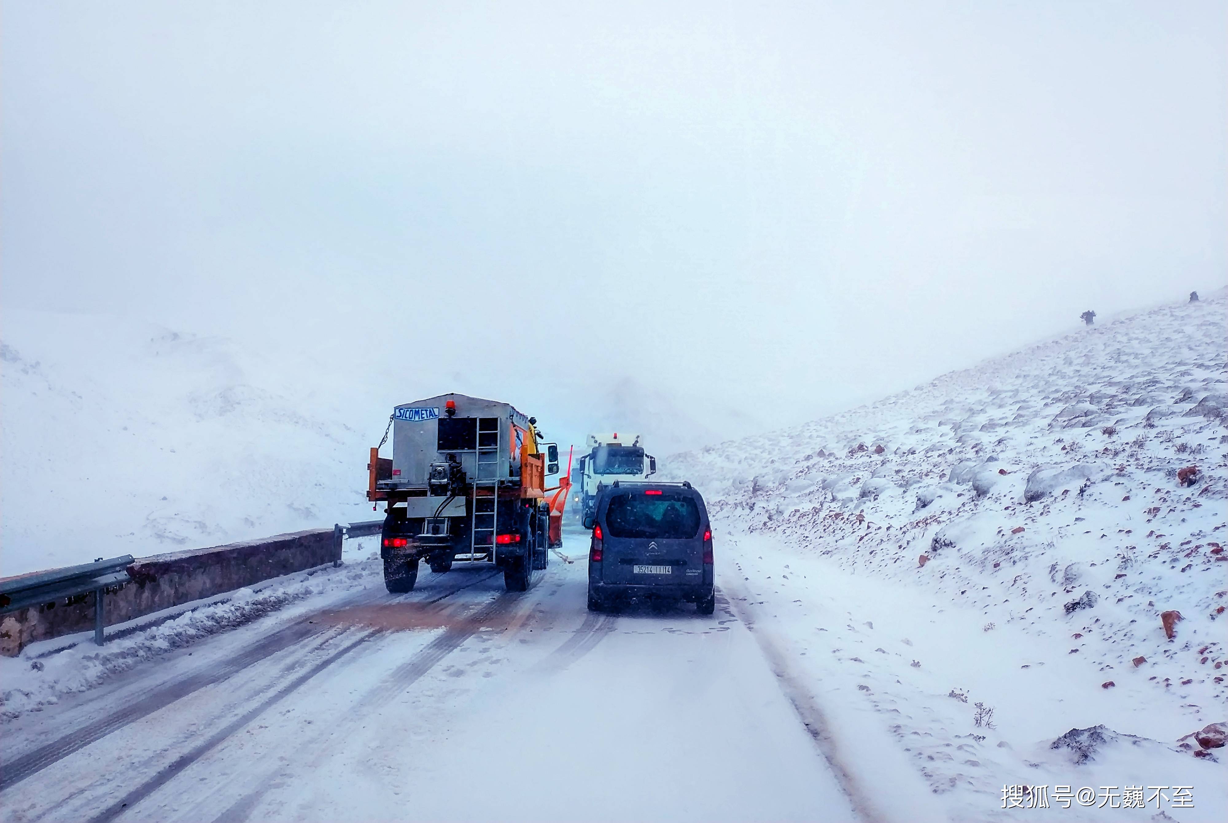 摩洛哥的路勤保障值得一赞,说半小时就半小时,一辆铲雪车闻风而来,所有的车辆主动避让路旁,令其畅通无阻。铲雪车先绕着大货车前后将厚厚的积雪铲除,又将货车前面挡住其发力的中巴拖走,周围的驾驶员也纷纷施以援手,或系绳、或垫石、或推车,大家齐心协力,二十多分钟后,大货车在众人的祈盼中再度启动,摇摆了十几秒,终于挣脱雪潭扬长而去,道路重新恢复通畅。