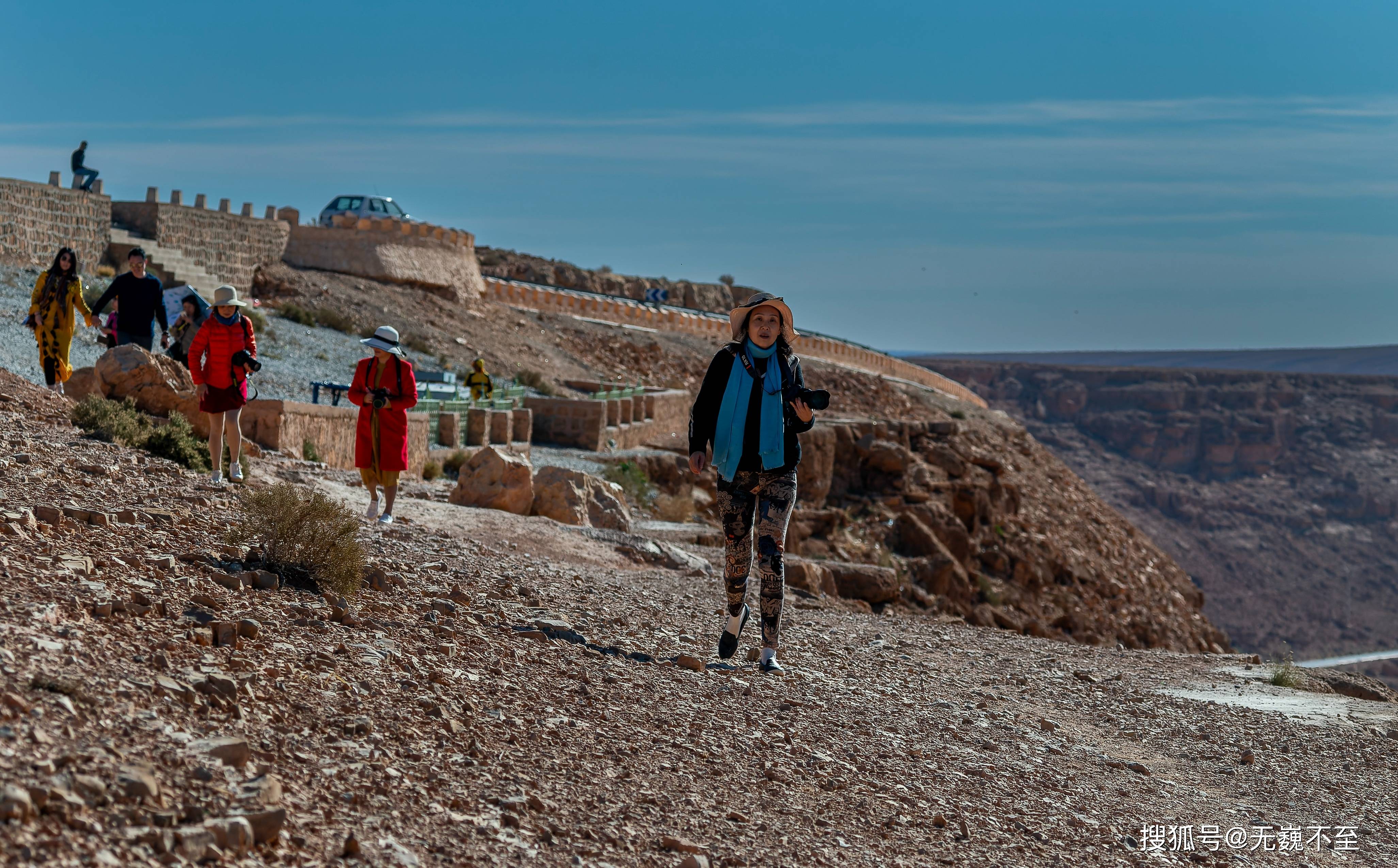 当大巴驶上一个辽阔的平坦高台地,按摩洛哥交通部门规定该停车休息了,领队略显神秘地叫大家到休息点外平台的边缘去看看,据说有惊喜。于是有性急的游客连跑带跳奔向前方,没想到冲出数十米后突然收住脚步探头张望并发出惊呼!