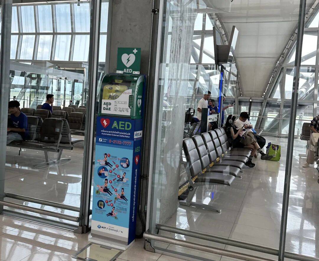 下飞机后,在长长的走廊我首先看到的是AED设施,也就是心脏急救设备。在欧洲的地铁里,每个站台都可以看到它的存在,没想到我在泰国机场第一眼看到的也是它。