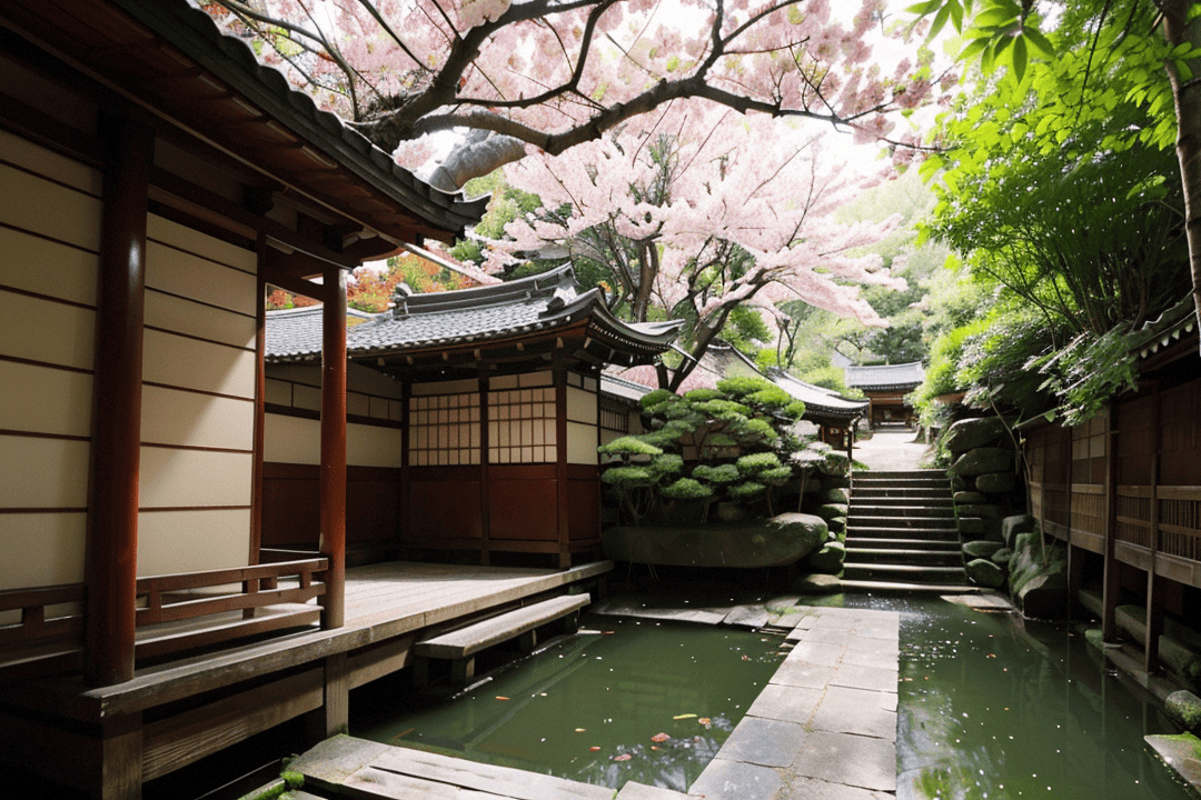 春天是京都最为迷人的季节之一。阳光柔和地洒在寺庙的屋檐上,樱花树满枝粉色花瓣,微风吹过时花瓣缓缓飘落,仿佛天空下起了粉色的雨。