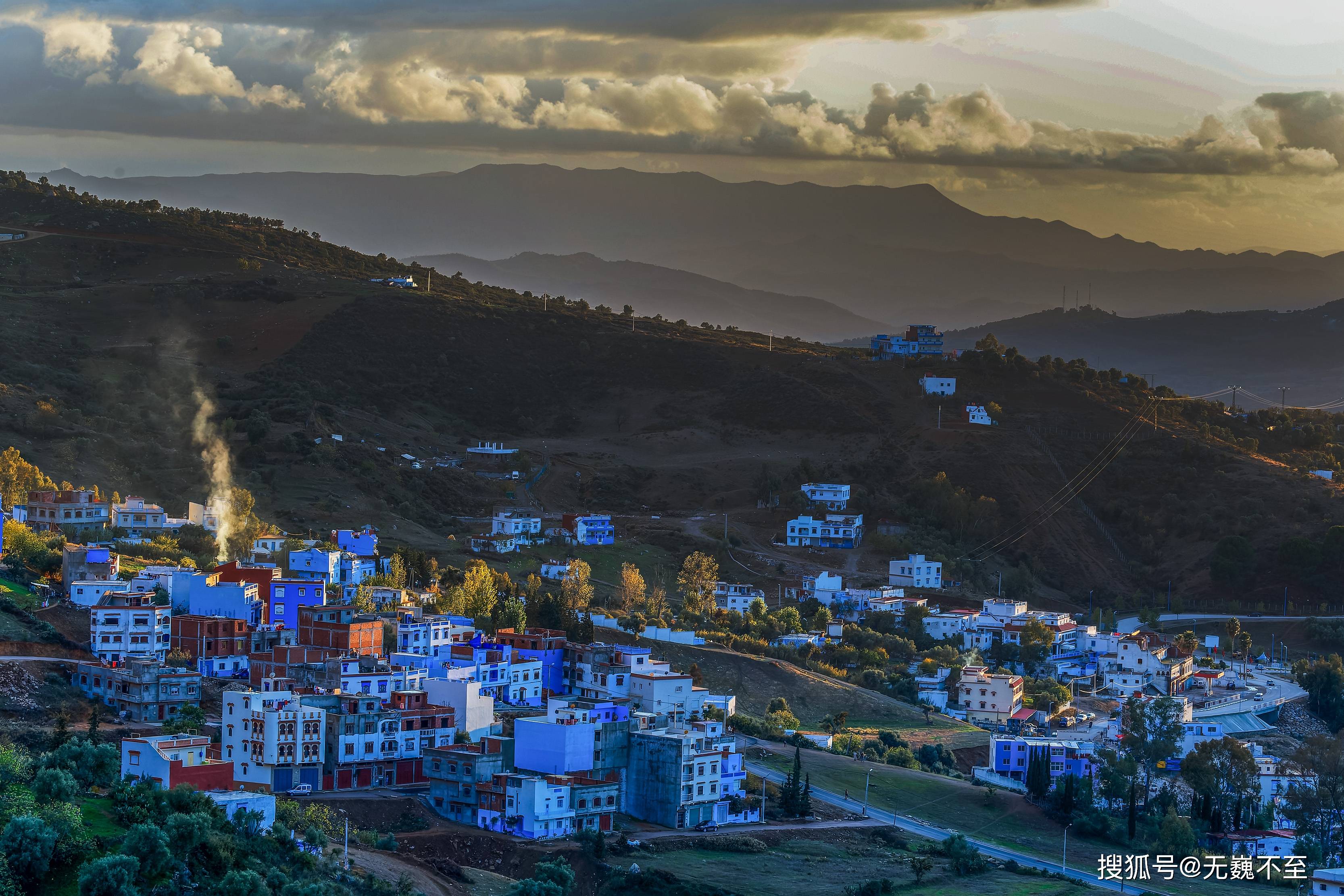 舍夫沙万静卧在里夫山脉宽阔而平坦的山谷里,蓝白房屋错落有致、鳞次栉比地铺满山坡,丛丛点点的橄榄树、椰枣树点缀其间,云层仿佛被一只无形的手轻轻拨开了一道缝隙,一片淡淡的、金黄的光线,像探照灯般斜射下来,恰好照亮了山谷对面的一小片房舍。那被点亮的蓝,瞬间变得鲜活、透明起来,如同蓝宝石的内部,被灯火骤然映照。