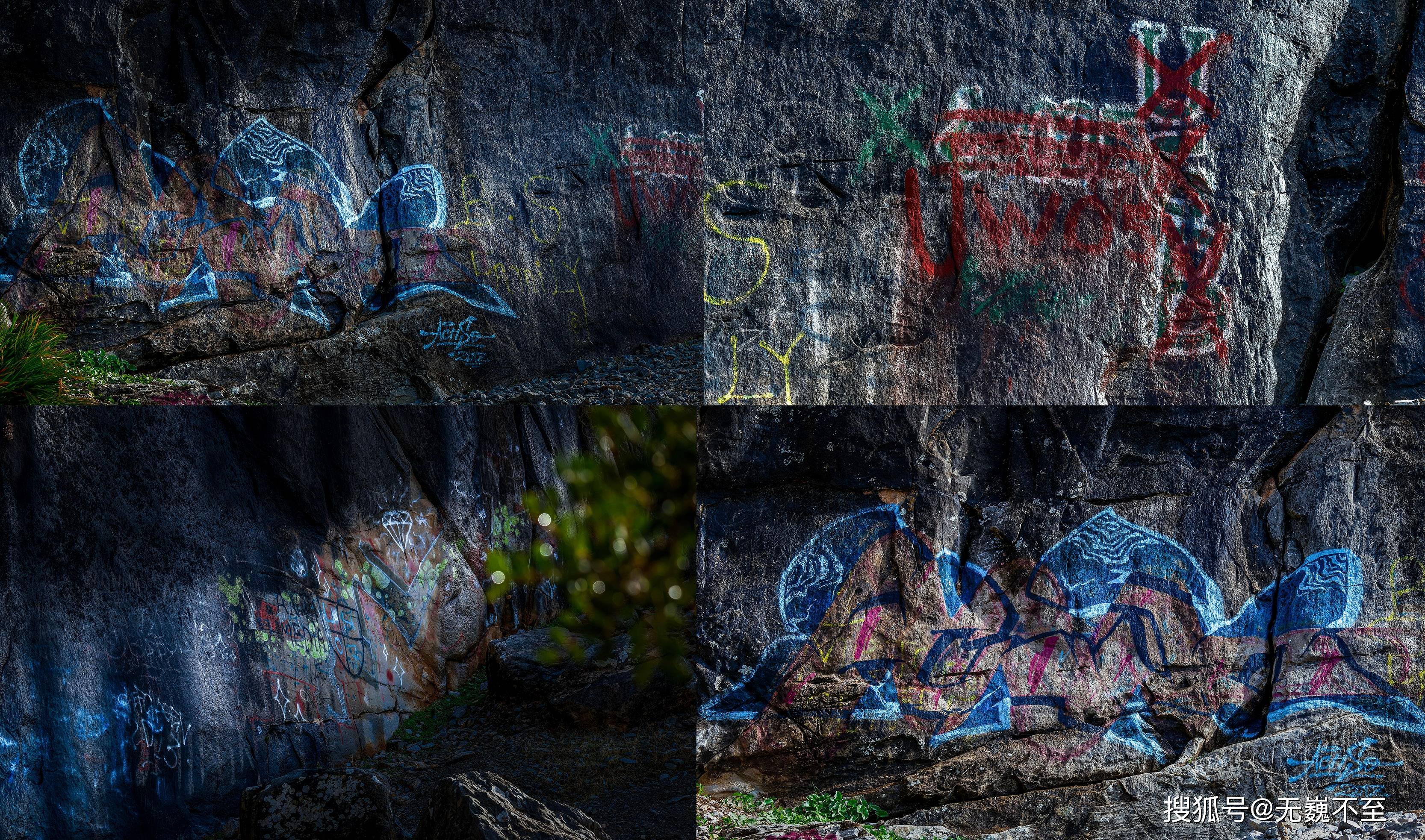 光影斑驳间,发现山路旁的崖壁上还有这些文字涂鸦,有点类似藏区的六字箴言。