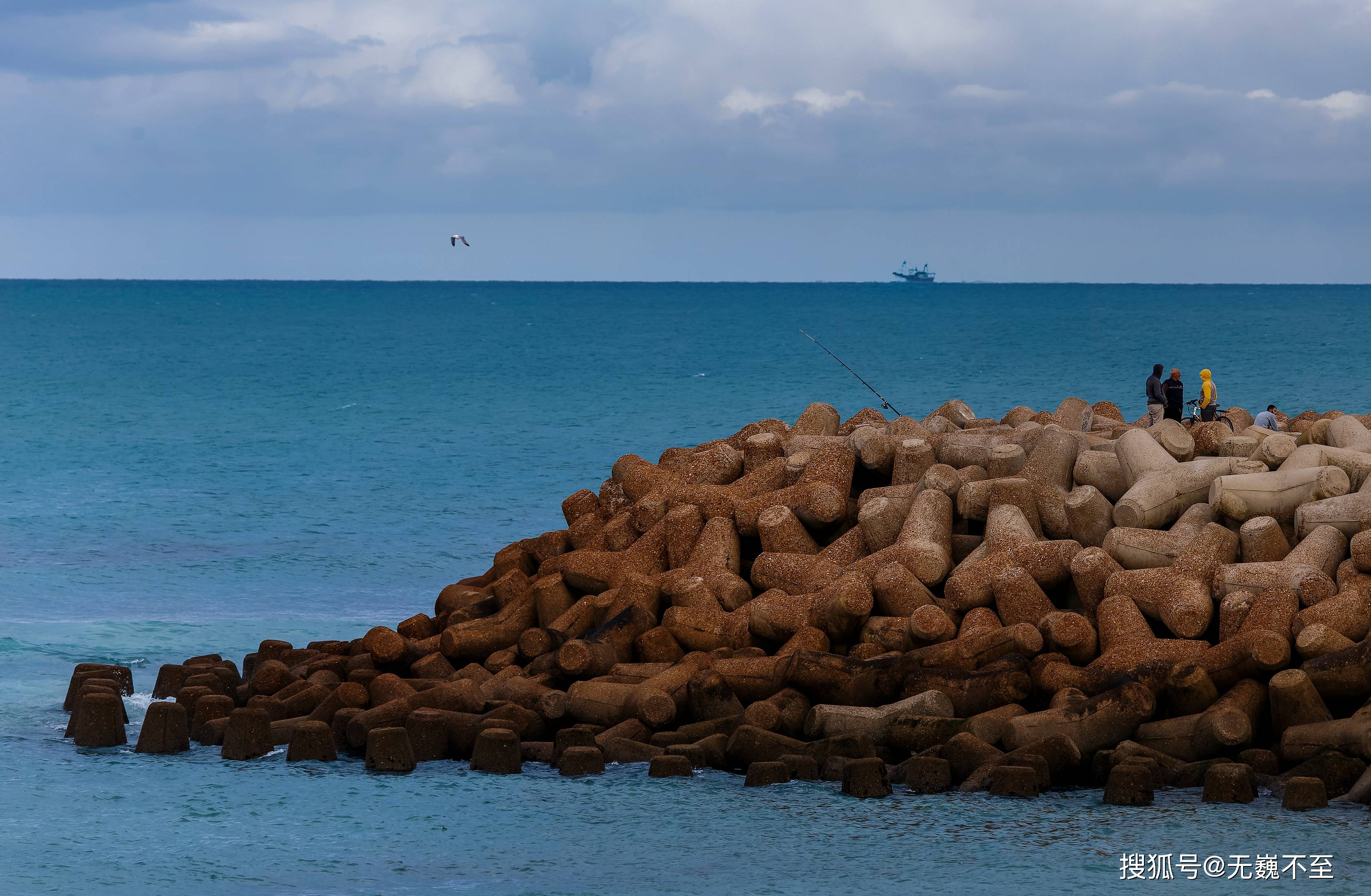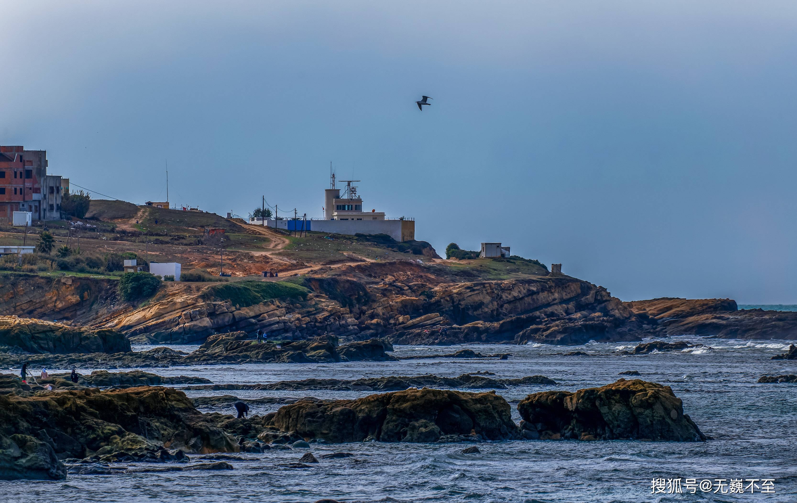 沿著海滩散步是一件非常愉快惬意的事,绵绵的浪,低翔的鸟,这就是世界第二大洋——大西洋!蔚蓝的浪涛拍打着斜斜插入海中的防波堤,飞溅起雪白的浪花,一只海鸥轻快飞过,几名海钓的摩洛哥青年则选好位置,摆好渔具,等待鱼儿上钩。