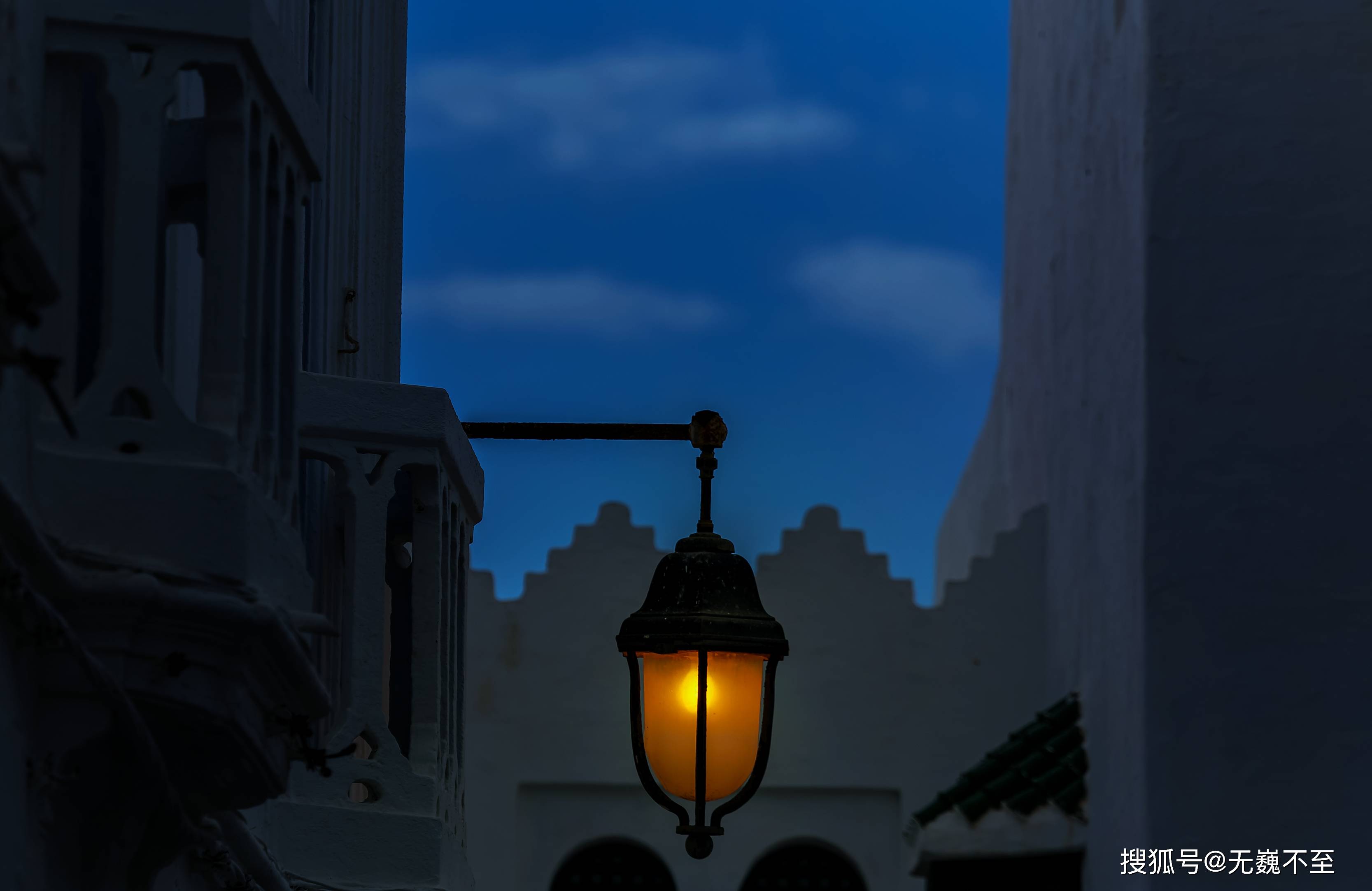 跟着领队穿过斑驳古旧的石头城门,进入幽静、狭窄的古城街巷,雪白的街巷、橘红的街灯,伊斯兰尖顶上是白白的云、蓝蓝的天,柔和的色调、温馨的氣氛,让人如同徜徉在尚未苏醒的蓝色梦境。