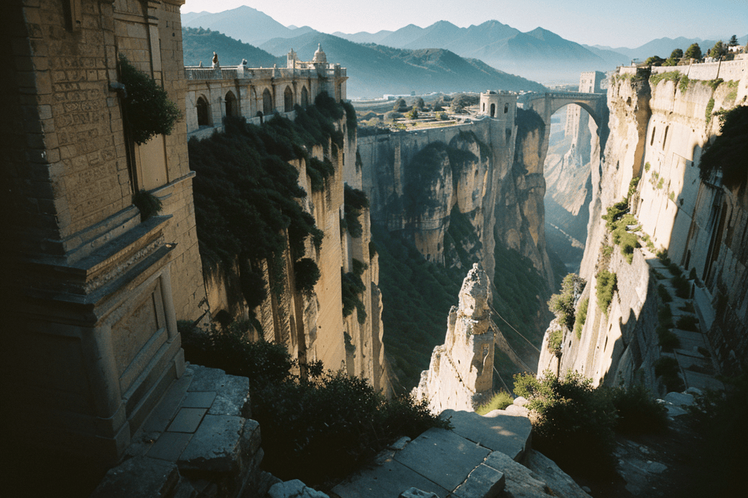 午后的龙达阳光炽烈,古城的石墙在光线下呈现出更深的色彩。人群开始增多,但城市仍旧保持一种不急不缓的节奏。我再次走回峡谷边,这次选择沿着悬崖小径下行。小径由石块铺成,沿着岩壁延伸,一侧是陡峭的峭壁,另一侧是不断升腾的空气。越往下走,峡谷的宽度越显夸张,那种大地裂开的力量变得更加明显。