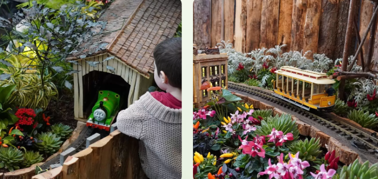 由近700公斤雪松木制成的巨型花盆,种植着2500株植物,为七条不同的模型火车轨道营造出四季变换的背景。跟随火车,欣赏它们穿过完全由植物材料搭建的加拿大标志性地标的微缩模型!