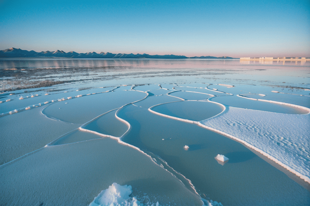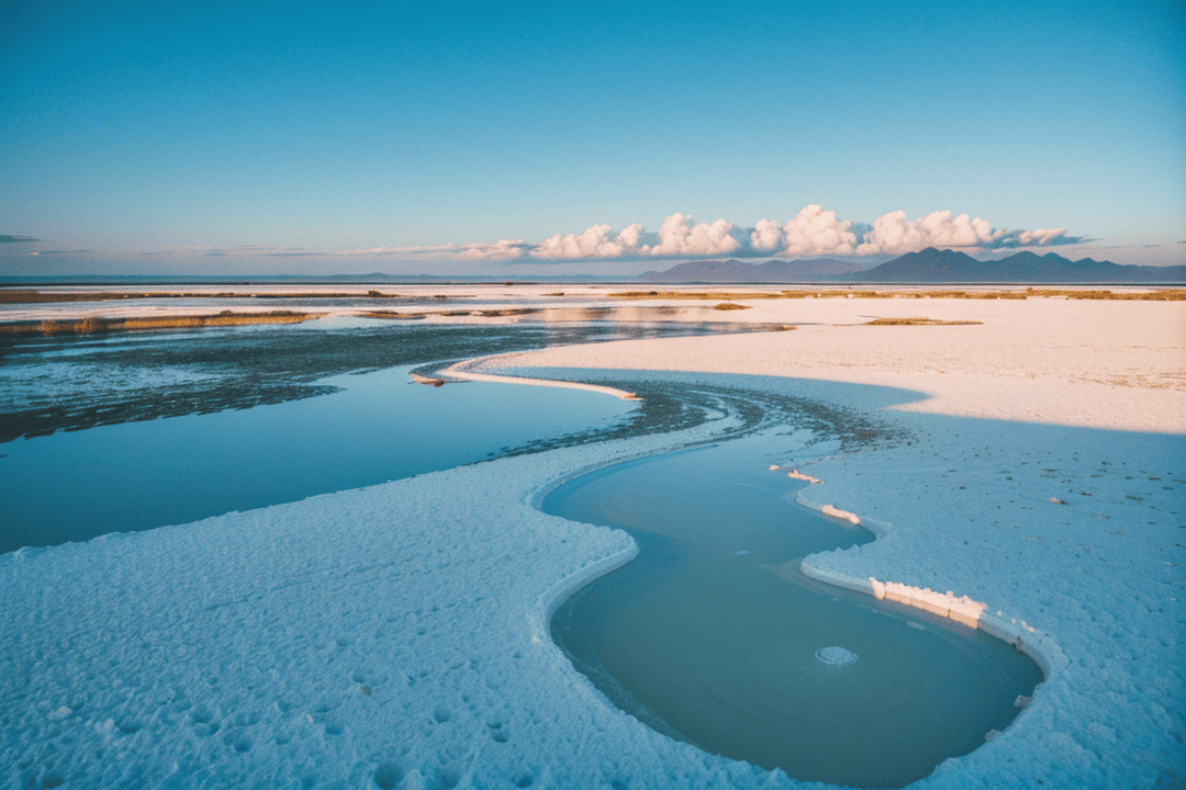 清晨的盐湖仍带着夜晚的寒意。薄薄的水层覆盖在盐壳之上,使地面如同一面巨大的镜子,天空的云层被完整复制,倒置在脚边。
