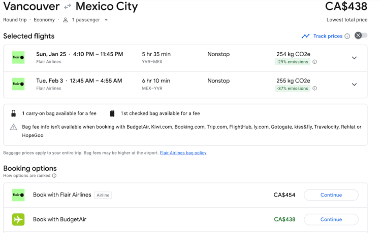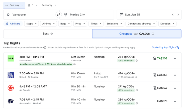 1 月 25 日星期日,Flair 航空从温哥华 (YVR) 直飞墨西哥城 (MEX) 的单程航班,票价仅为 208 元。这家廉价航空公司比加航与墨西哥航空的直飞航班价格(分别为 367 元和 373 元)便宜 150 多元。