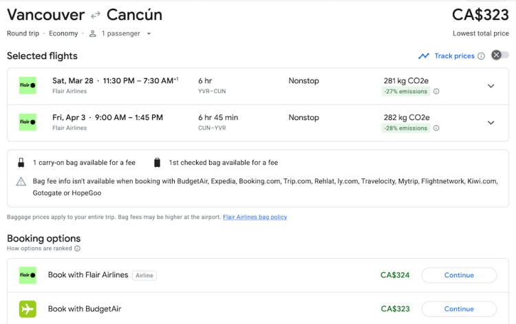 从温哥华直飞坎昆的往返航班,Flair 航空的机票也是最便宜的。例如 3月28日星期六出发,4月3日星期五返回的机票价格为323元。