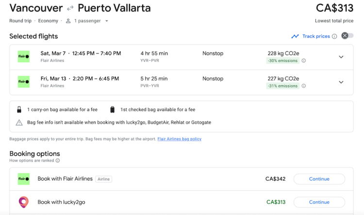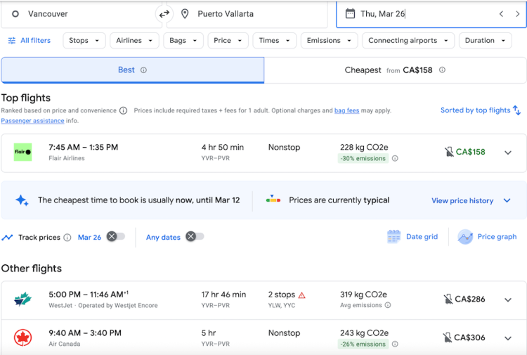 3 月 26 日星期四从温哥华直飞巴亚尔塔港国际机场 (PVR) 的单程航班,由 Flair Airlines 运营,票价为 158 元,比第二便宜的选择(加航) 的306元便宜一半。