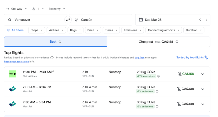 Flair 航空 3 月 28 日星期六从温哥华 (YVR) 直飞坎昆国际机场 (CUN) 的单程航班,票价仅为 158 元,非常划算。