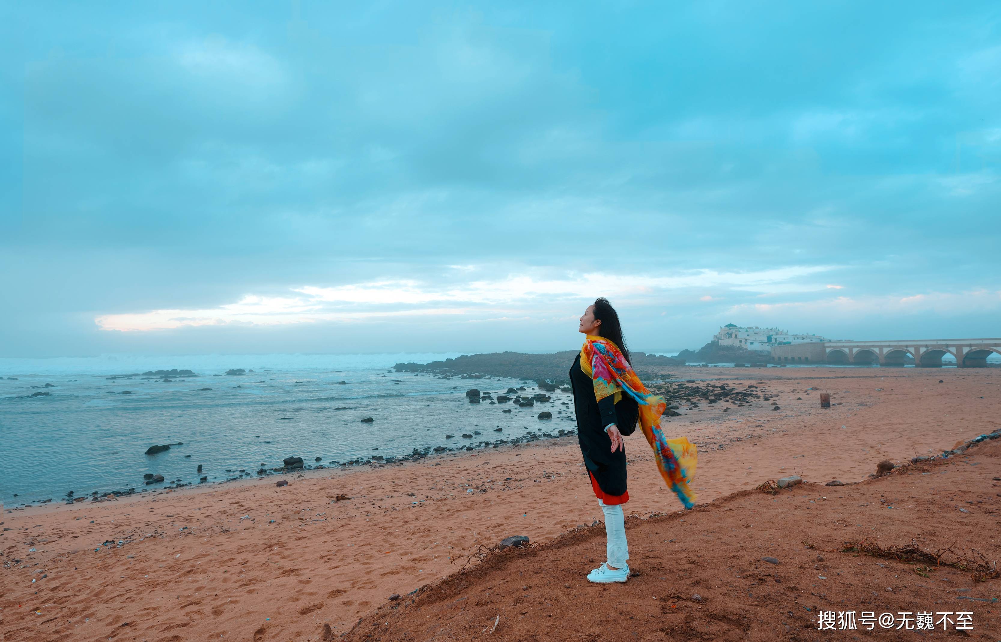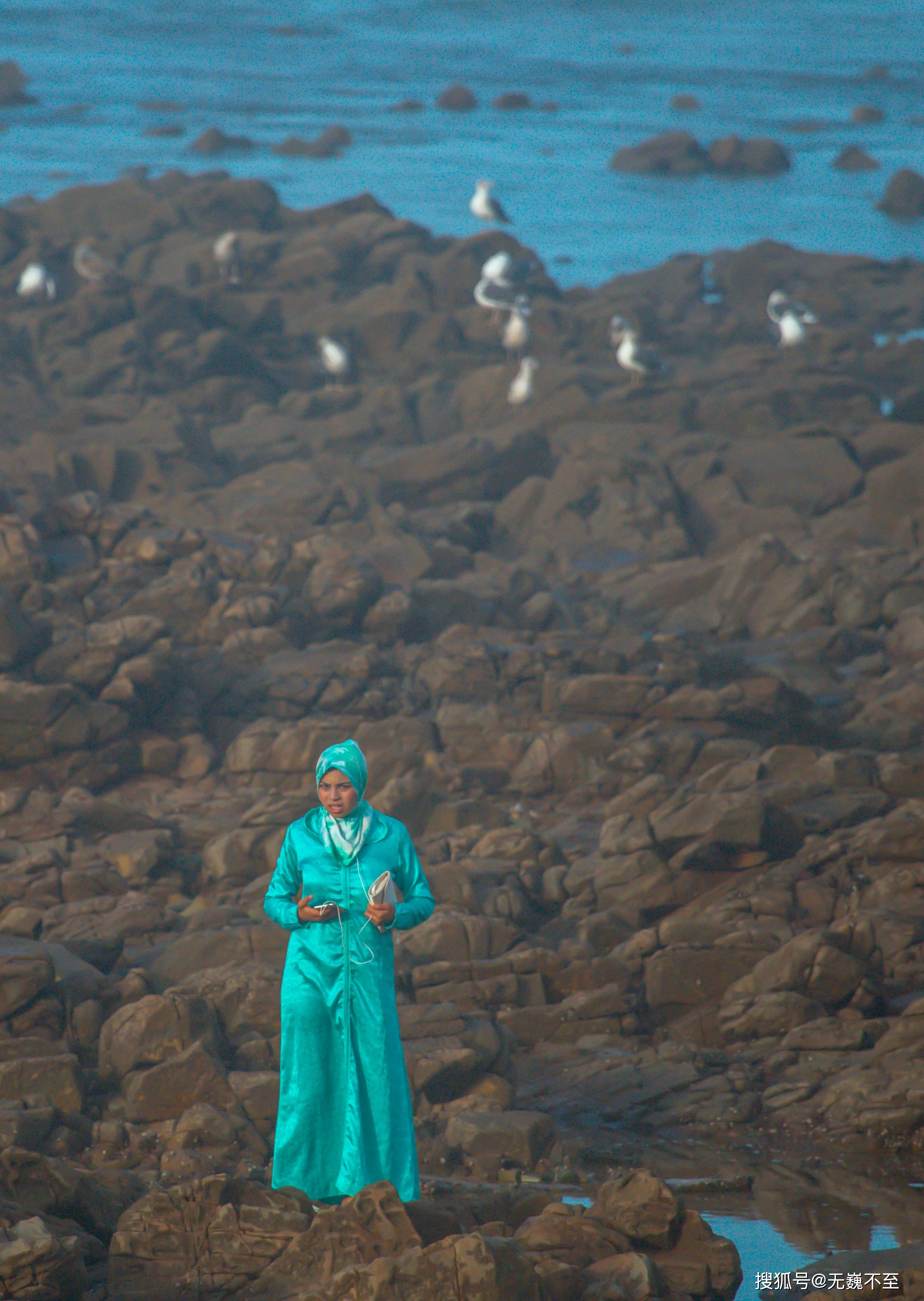 一位胆大的柏柏尔美女不顾乱石嶙峋,小心翼翼在石滩上挪动着去和海鸥们合了张影。