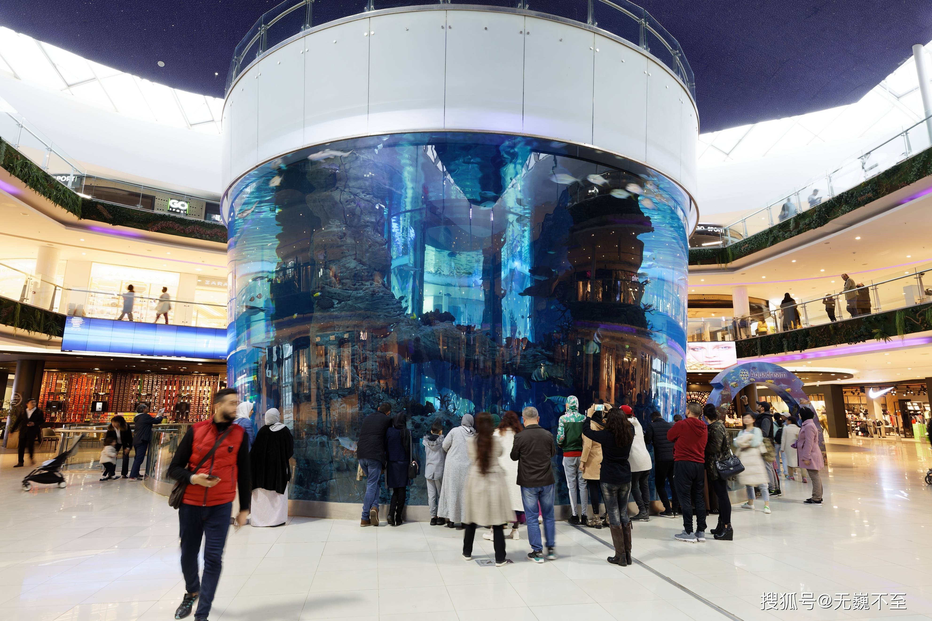 这个购物广场别具一格,中央设有一个四楼高的水族箱,容量100万公升,是世界上最大的倒圆锥形水族箱,鲨鱼从容地巡游,鳐鱼像水下芭蕾舞者般优雅滑翔。孩子们贴着玻璃,眼睛睁得圆圆的。一位母亲轻声用阿拉伯语向孩子解释每种鱼的名字,那场景温馨而动人。