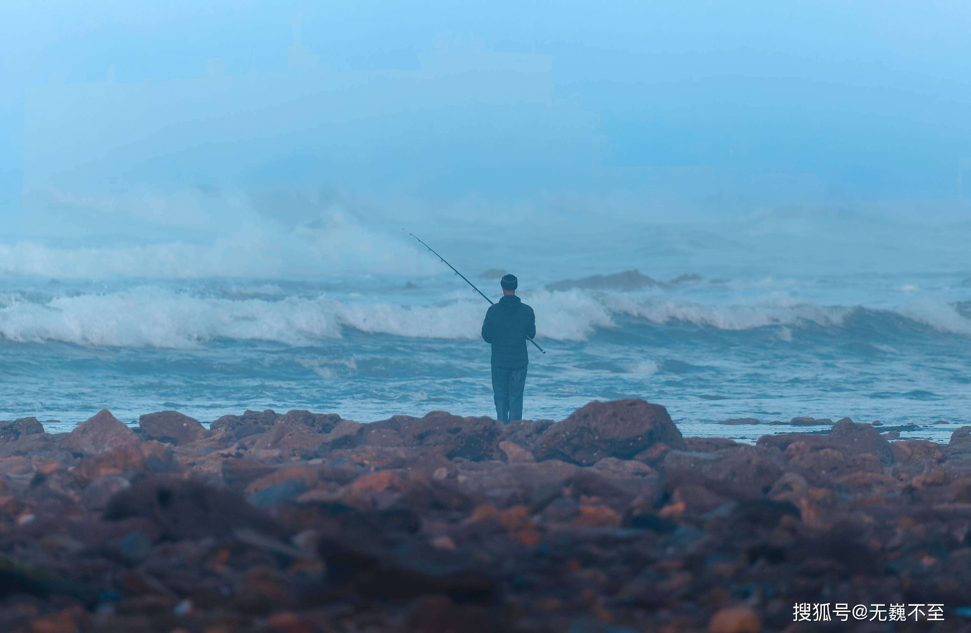 面对惊涛骇浪,一位垂钓者如雕塑般静默站立,等待和笃定也是一种安稳的美!