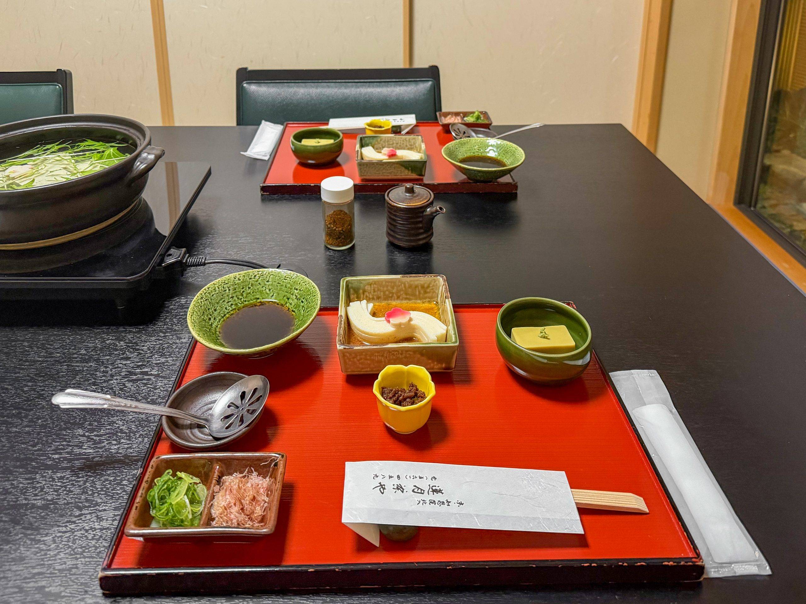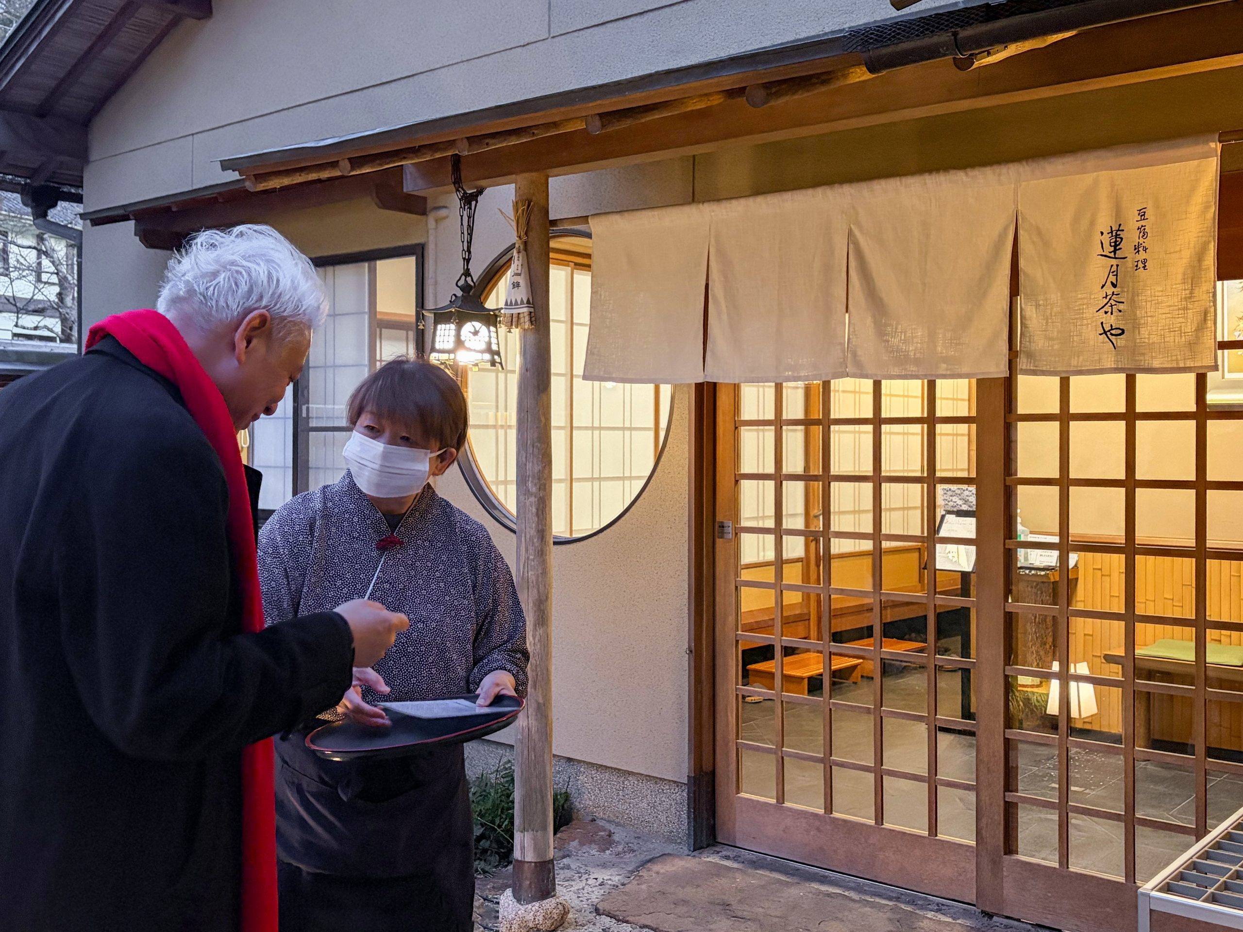 走近了看,那是一盏石灯笼,灯罩上刻着“莲月茶屋”四字。那光不是亮堂的,是朦朦的、温润的,像深秋将熄的炭火,也像古画中佛陀低垂的眼眸里流露出的,那种近乎慈悲的暖意。灯笼旁,一块木招牌在微光中显现,“豆富料理”——就是这简单的四个字,像一枚钩子,瞬间挂住了我们这些异乡人的脚步。