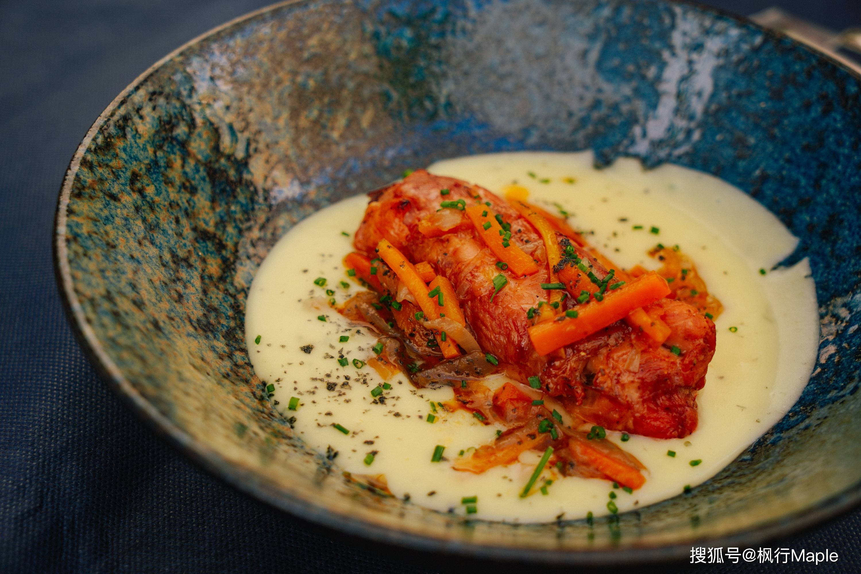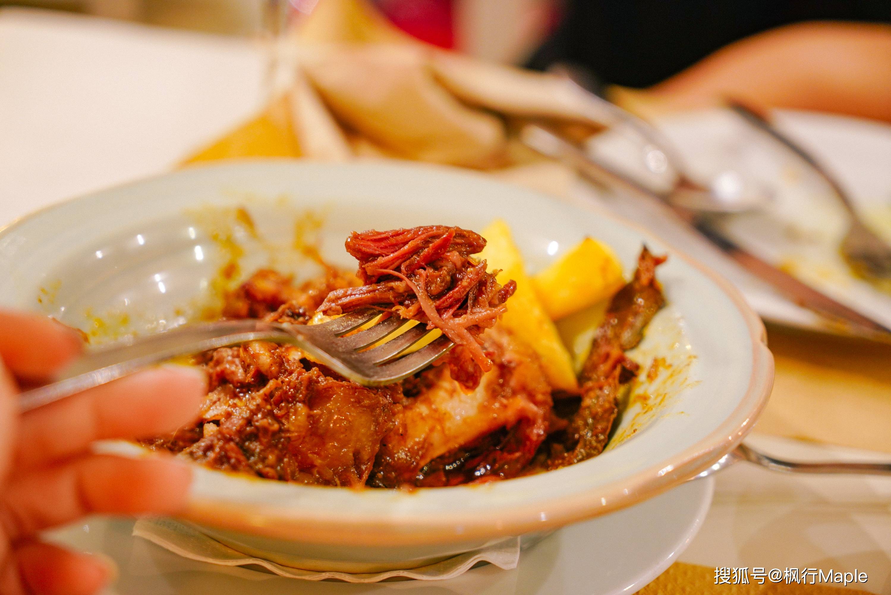 牛尾在红酒、番茄、洋葱和香料的包裹下炖至软烂,入口即化。
