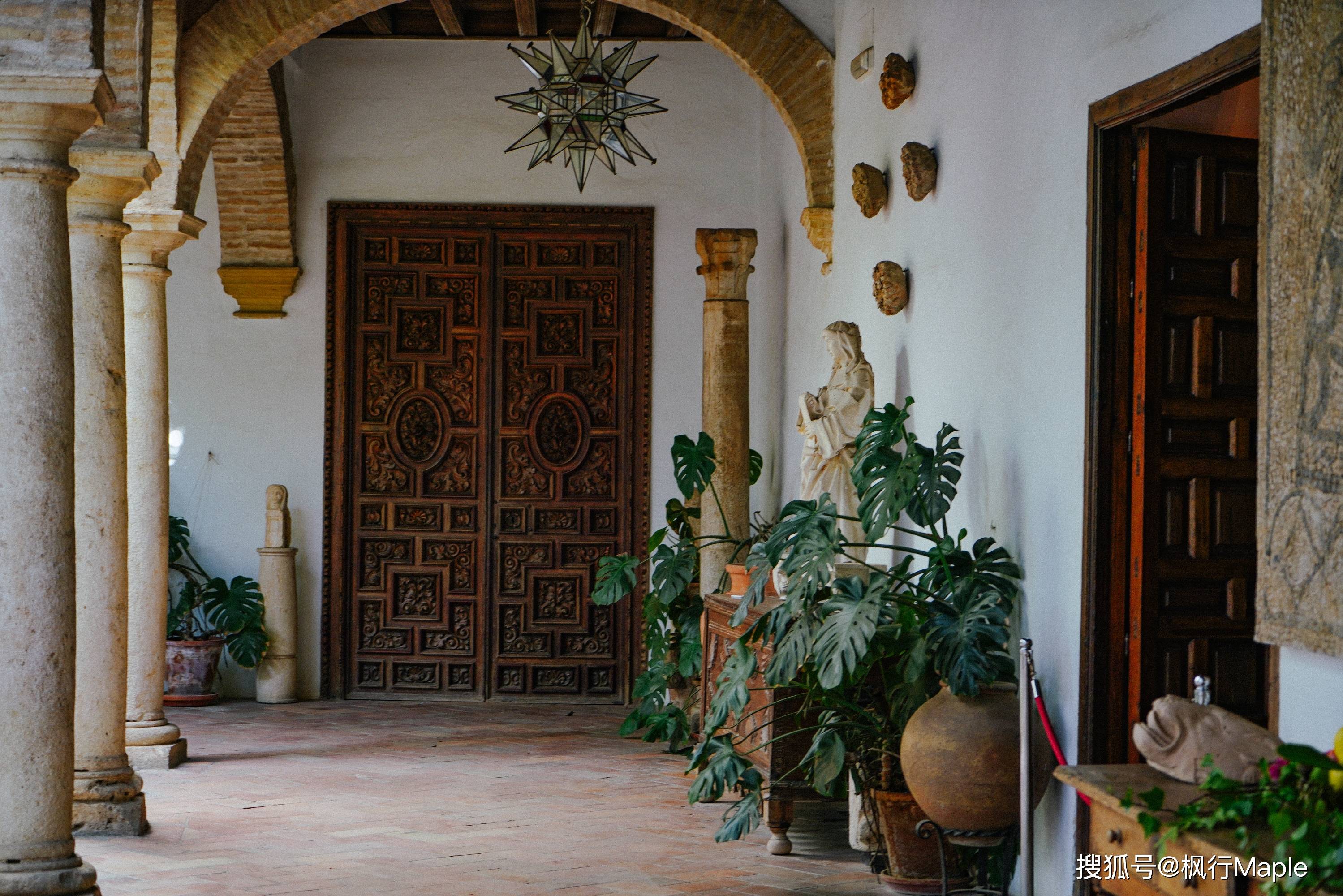 建筑整体是一座历史悠久的贵族住宅,走廊里和一些房间内,仍然布置着古老的家具,和生活用品。阴凉处,陶罐中的超大龟背竹状态很好,圣母像与摩尔纹样的木门相得益彰。