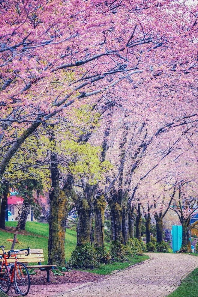 这是最容易被忽略,但其实范围最大的赏樱区域。樱花是“分散式”分布,可以边开车边找,Fort George附近比较多。