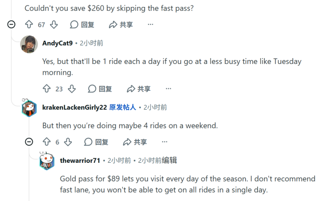 虽然票价引发大量吐槽,但也有网友持不同看法。有的网友认为,快速通道本就是"奢侈选项",不是必需品,普通门票加上合理安排一样能玩到热门项目。还有网友建议购买 $89 的 Gold Pass 年票,如果一年能去多次,反而更划算。