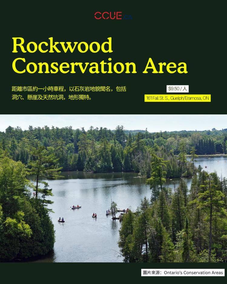 Rockwood Conservation Area距离市区约一小时车程,以石灰岩地貌闻名,包括洞穴、悬崖及天然坑洞,地形独特。