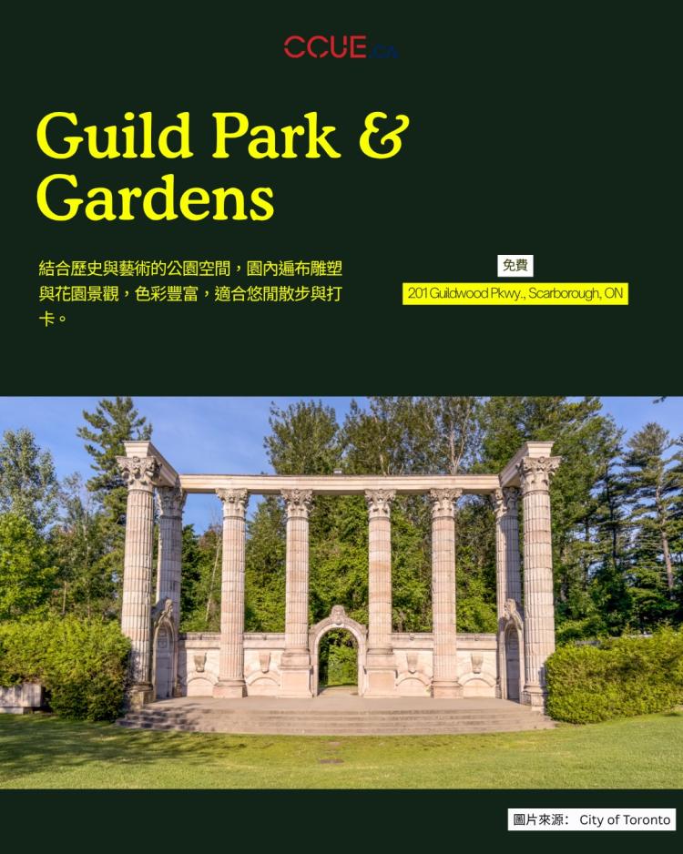 位于士嘉堡的Guild Park & Gardens则结合历史建筑遗迹与园林艺术,园内雕塑与花卉交织,适合拍照及悠闲散步。