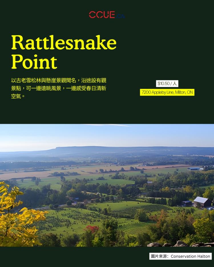 喜爱高处景观的市民,可前往Rattlesnake Point,该地以古老雪松林及悬崖景致闻名,沿途设有观景台,可远眺春日山林景色。