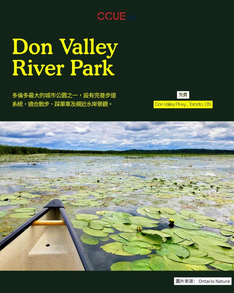 市区内方面,Don Valley River Park作为多伦多最大城市公园之一,拥有完善步道及单车径,是市民日常亲近自然的热门地点。