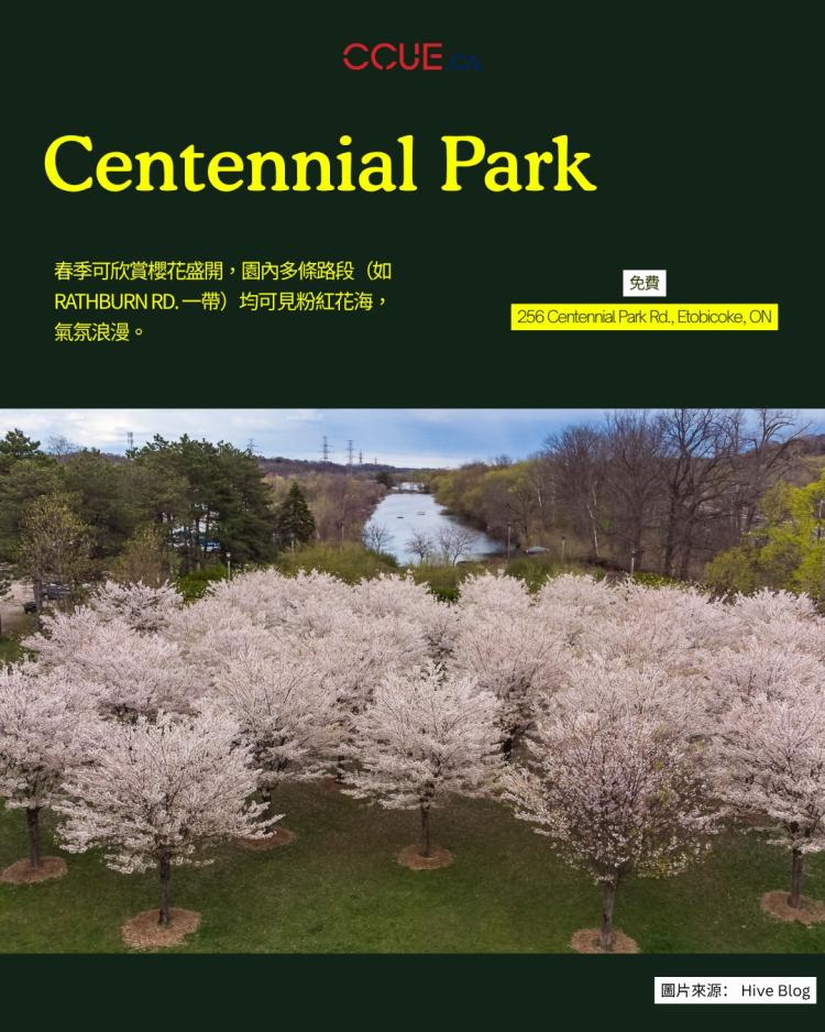 樱花爱好者则可到Centennial Park,园内多处可见粉红花海,吸引不少市民前往拍照留念。