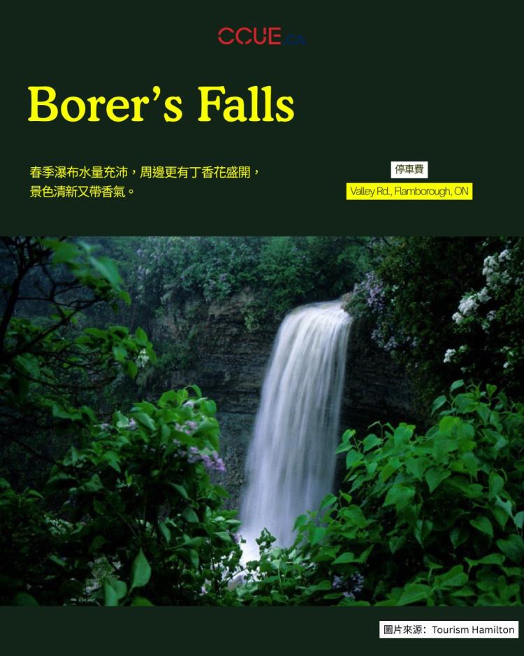 Borer’s Falls春季瀑布水量充沛,周边更有丁香花盛开,景色清新又带香气。